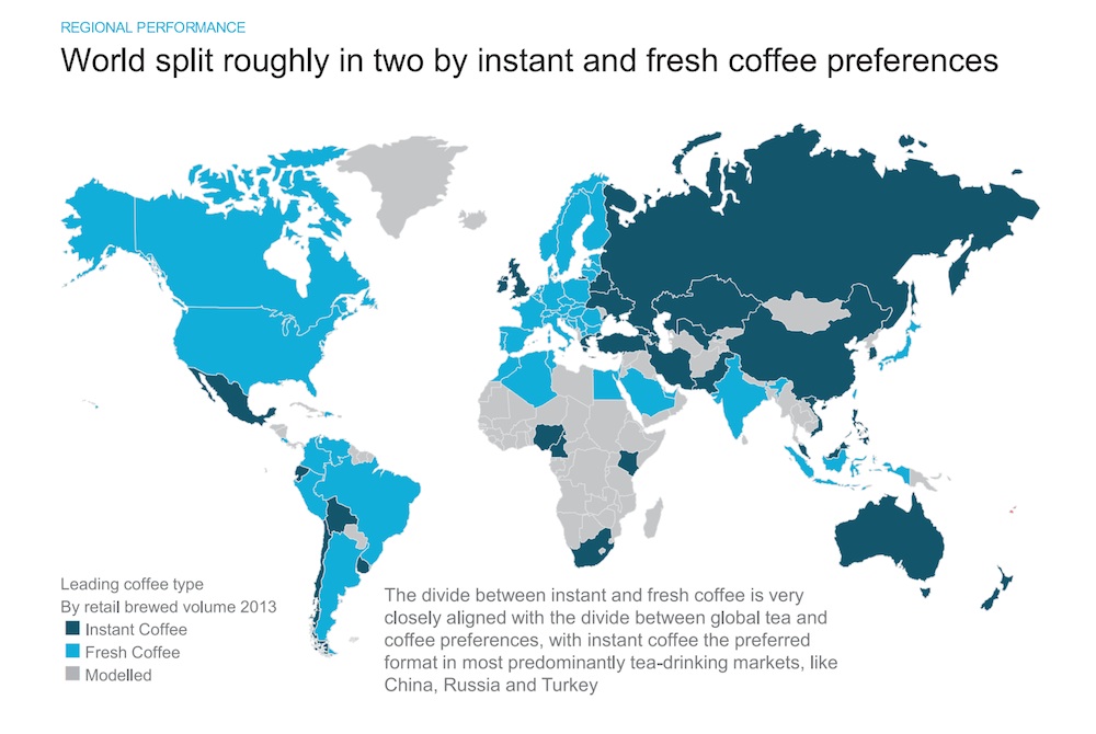 Check out this map, which divides the world in two by preference: instant coffee or fresh coffee. (Just to be totally clear on our definitions, instant coffee refers to traditional additive-filled, soluble, largely-not-actual-coffee products, while “fresh” here refers to pods and other ground coffee. Additionally, for the purposes of this map, “retail brewed volume” actually refers to retail sales by volume of home brewed products.)