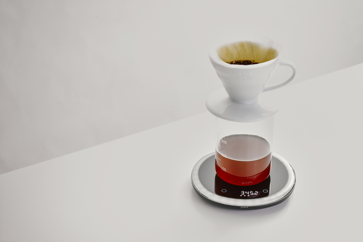 The PourX Oura scale, designed by the team behind the Jimmy Scale now sold by Hiroia, features an LED-loaded exterior edge that glows different colors and patterns to guide users through various stages of brewing.