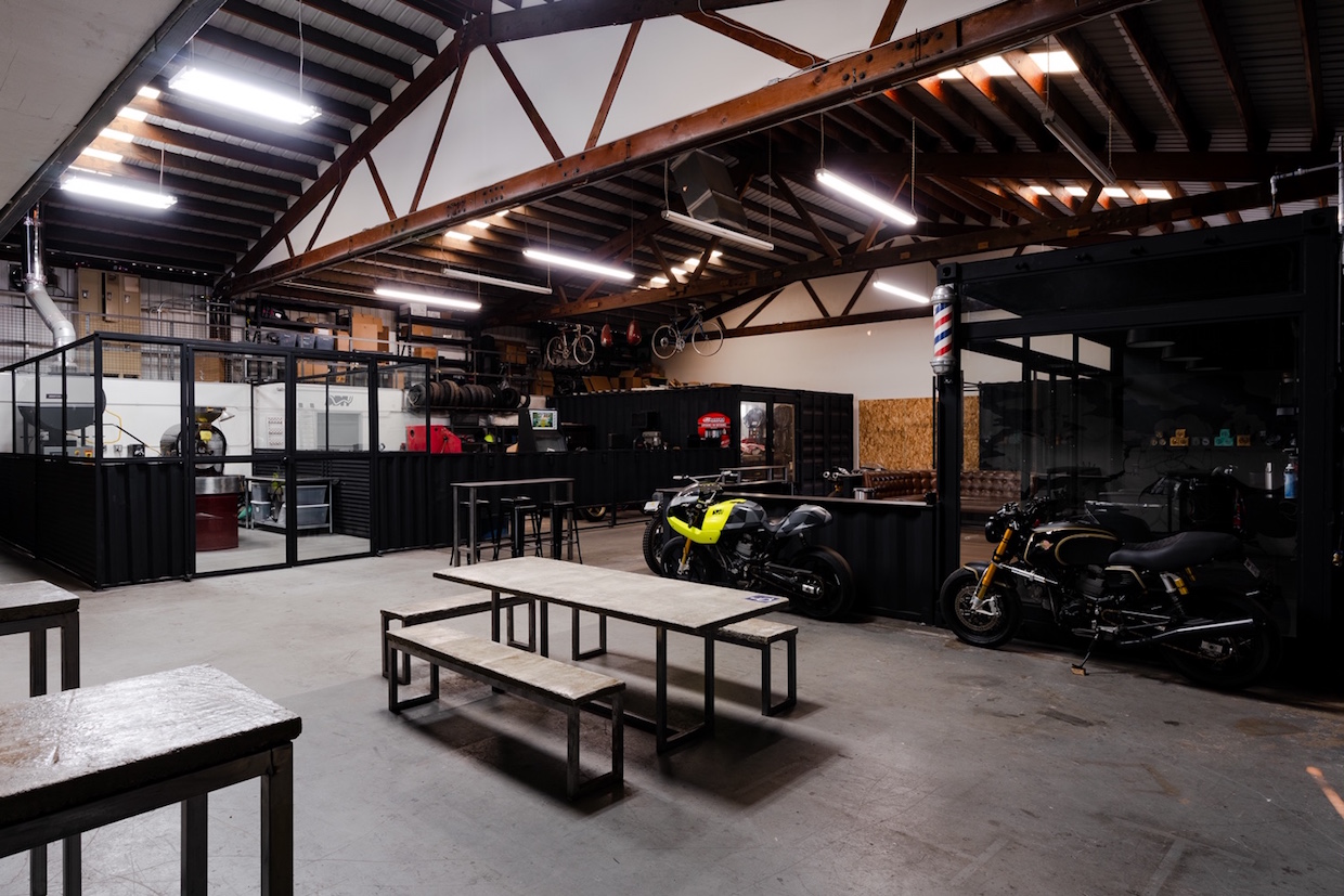 Ardel told Daily Coffee News the building was initially divided into five separate spaces, one of which has been occupied by a surfboard-shaping workshop. Ardel took over the remaining four spaces, knocked down the main walls between them and then created less obstructive partitions between what is now an appointment-only barber shop, an Italian motorcycle customization garage, and a creative design agency.