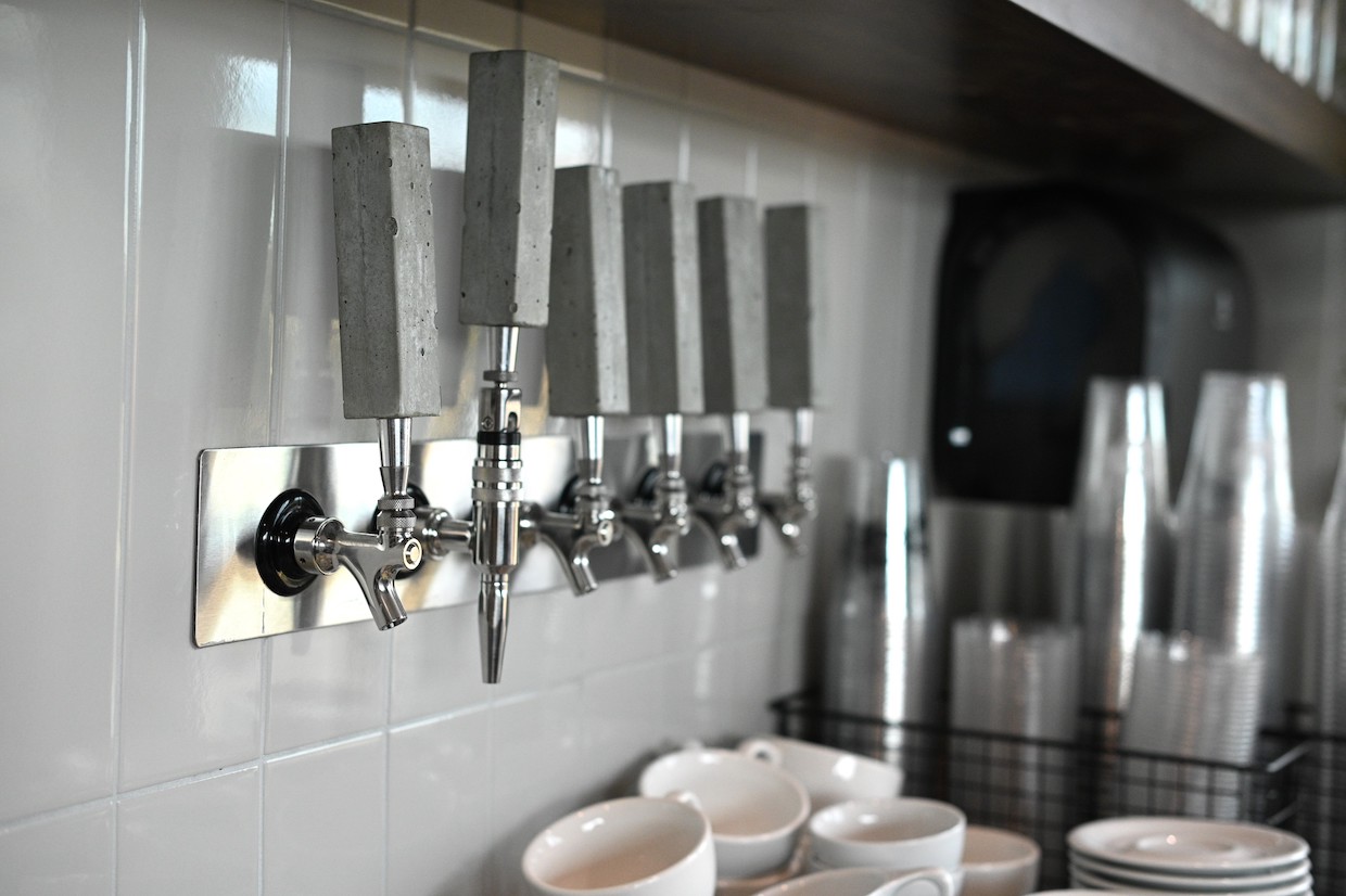 On the custom concrete slab bar, a Mahlkönig EK43S grinds for manual pourovers as well as single cups brewed by two Marco SP9 brewers. Kegged Peixoto cold brews, seasonal drinks and house-made tonics are dispensed through a tap wall with six concrete tap handles.