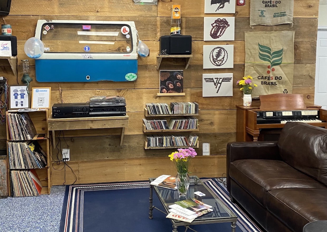 Pine walls now surround the Diedrich IR-12 roaster through which Delmonico browns green coffee currently sourced through Genuine Origin and Royal New York. The same wood was used to build the roastery’s tasting bar, a brew station with a La Spaziale espresso machine, and shelving for a turntable, LPs, CDs and a pair of speakers.
