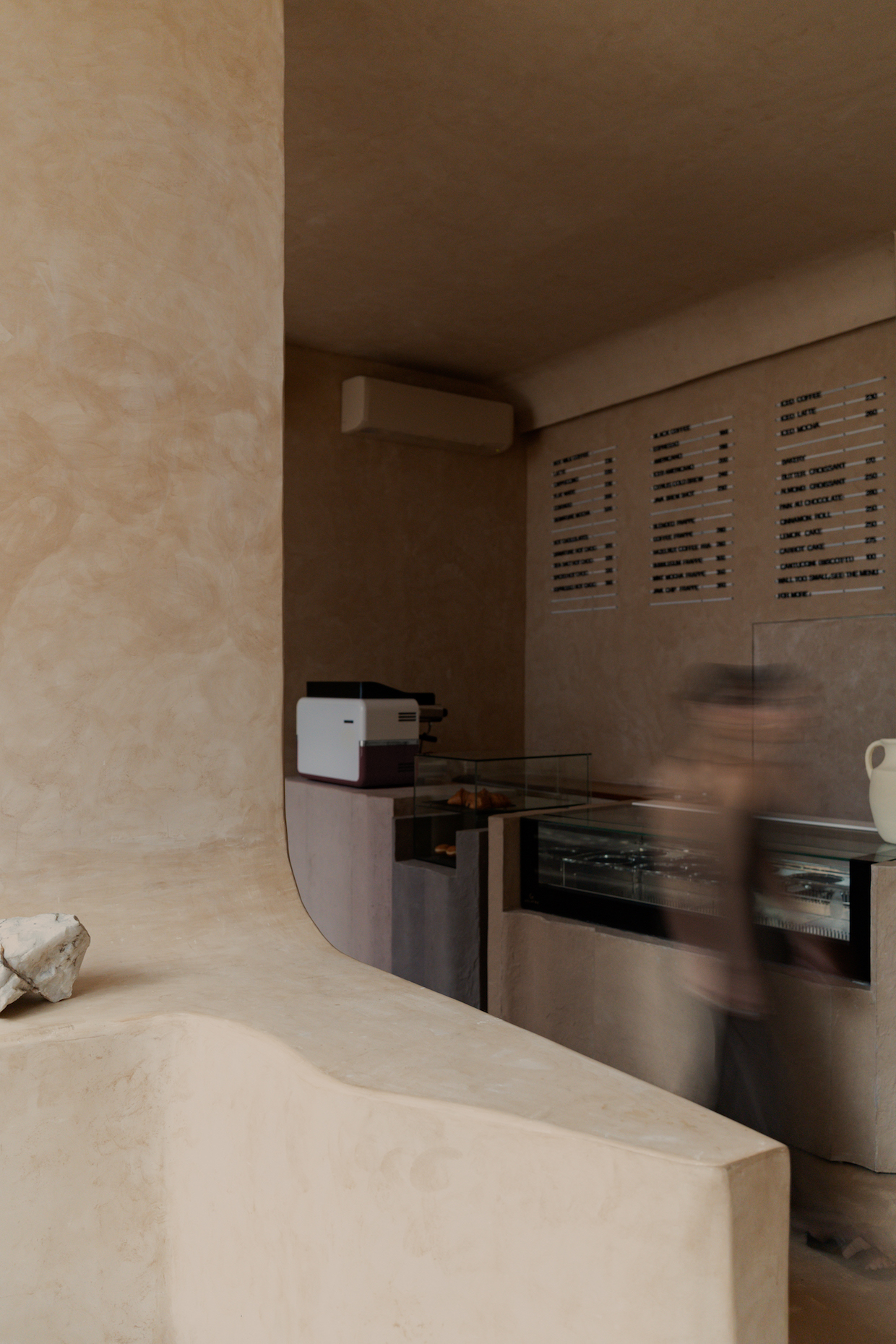 The designers sought to create a singular texture for all the surfaces — walls, ceiling and floor — while allowing the coffee and gelato to be the heroes of the space.