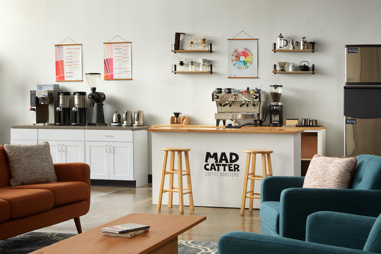 In between sits a comfy couch and a coffee table with matching midcentury-modern lounge chairs. Mad Catter Coffee Roasters founder Jeffrey Wetzel is currently cooking up plans for the space that might involve education or just general coffee-related hangs.