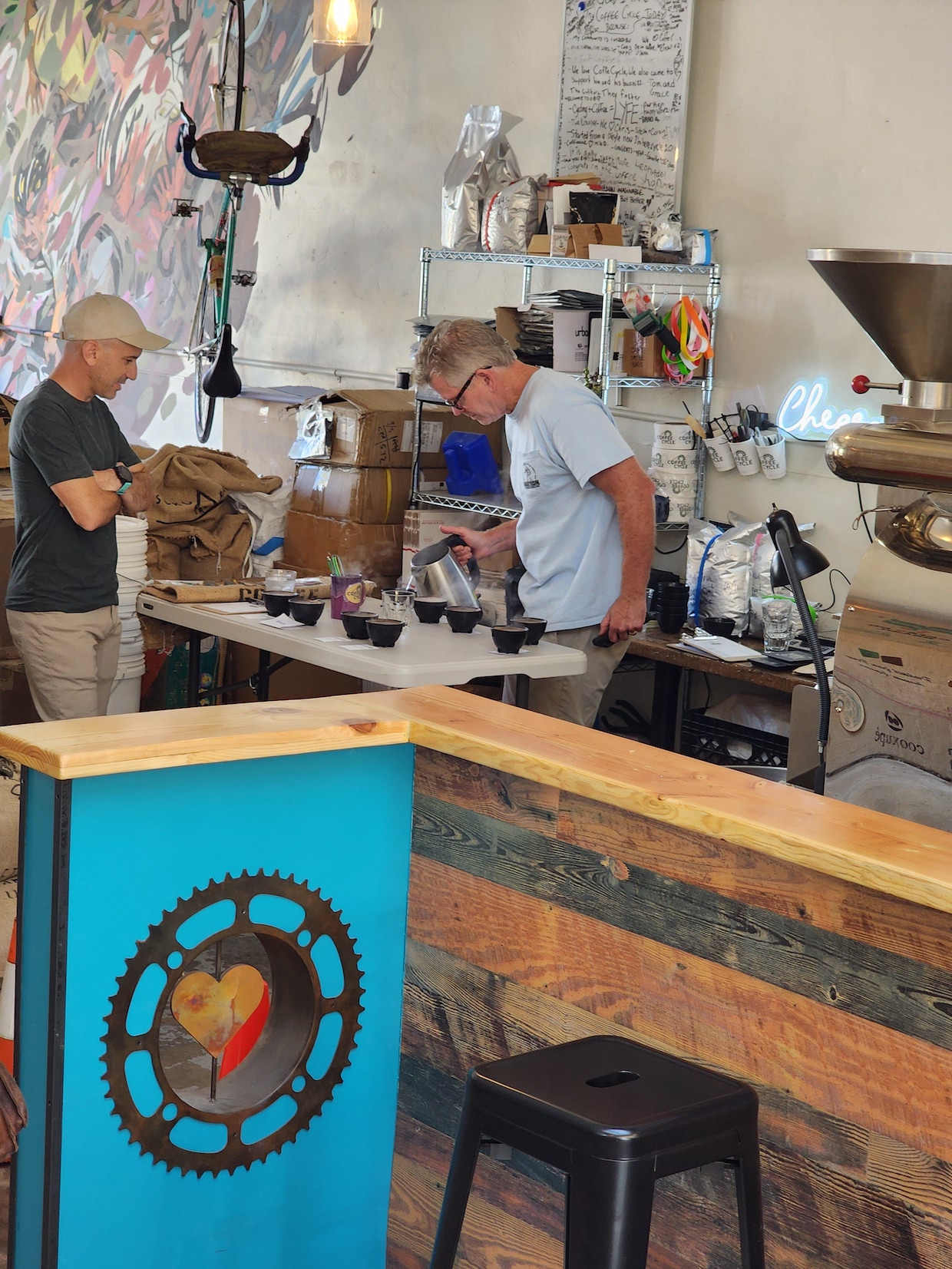 The new shop is also the production home of another San Diego specialty coffee business, Chuck’s Roast. Prior to striking out on his own, O’Brien was a longtime employee at the original location of Bird Rock Coffee Roasters, founded by Chuck’s Roast creator Chuck Patton. While neither of the coffee pros are affiliated with Bird Rock today, they are occasionally working side by side, with Patton occupying about 100-square-feet inside Coffee Cycle with a Giesen W1S machine standing alongside O’Brien’s 5-kilo Mill City Roasters machine.